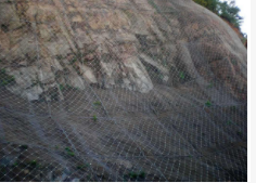 边坡防护网由钢丝绳网或环形网(需拦截小块落石时附加一层铁丝格栅)、固定系统(锚杆、拦锚绳、基座和支撑绳)、减压环和钢柱四个主要部分构成。